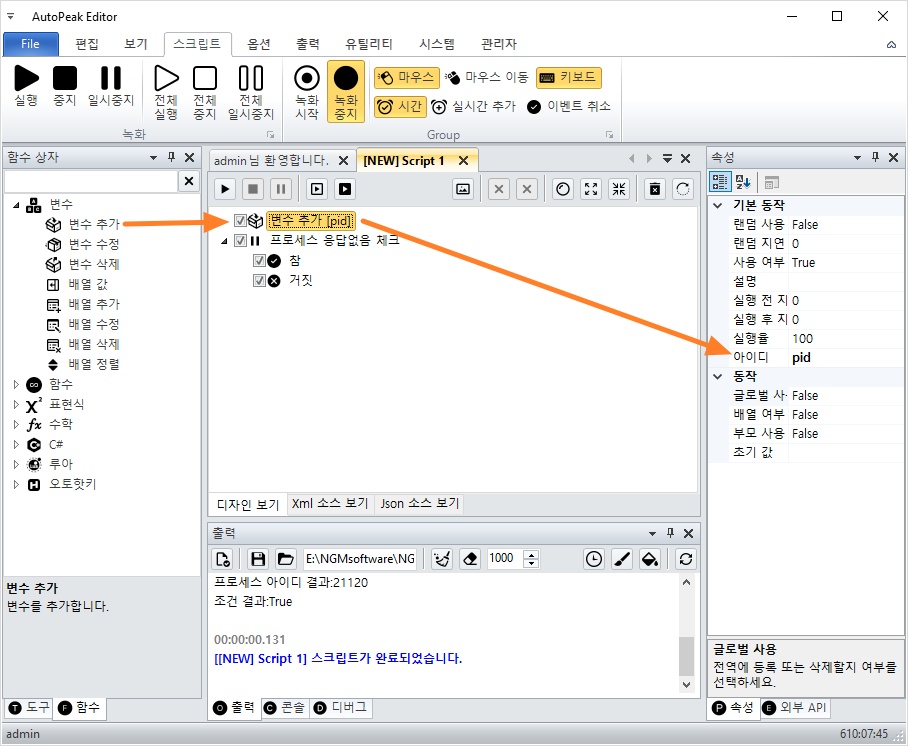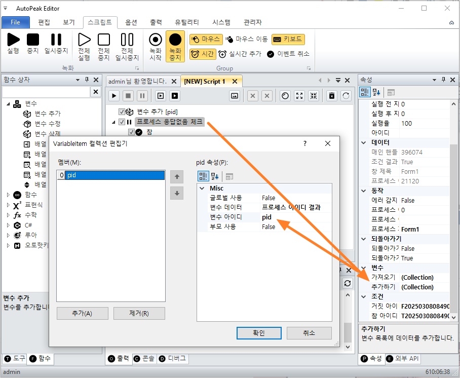 프로세스 응답없음 체크 액션에서 변수 추가하기를 클릭하세요.
