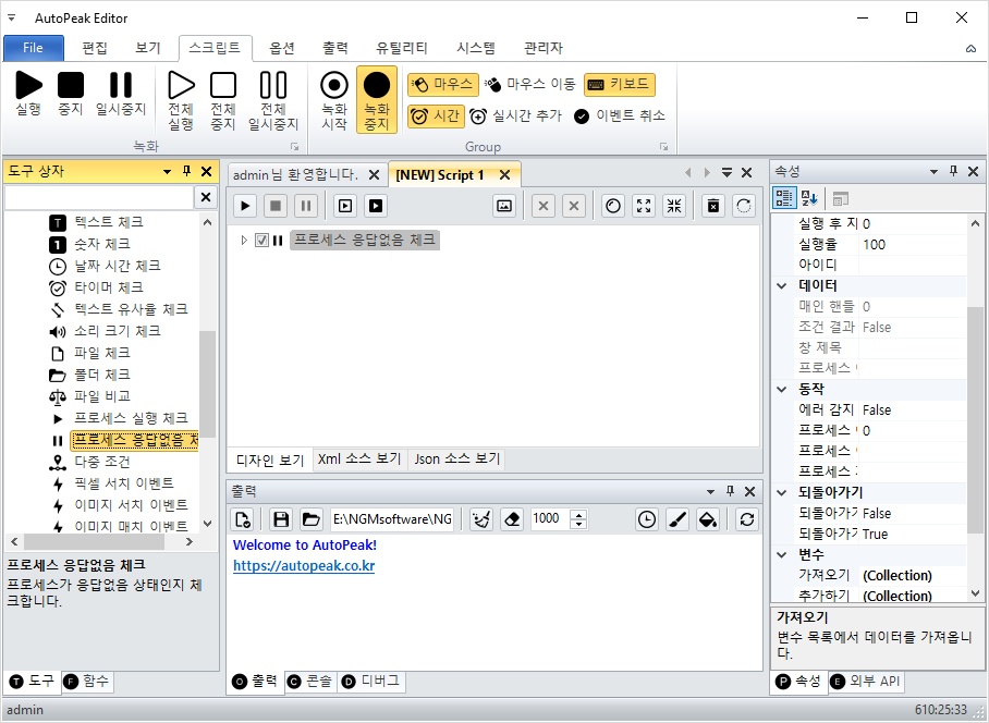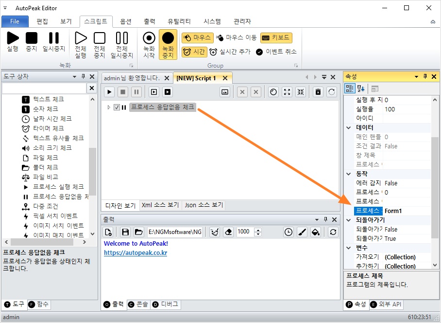 오토픽 매크로를 실행하고 도구상자의 조건 카테고리에서 프로세스 응답없음 체크 액션을 더블 클릭하세요.