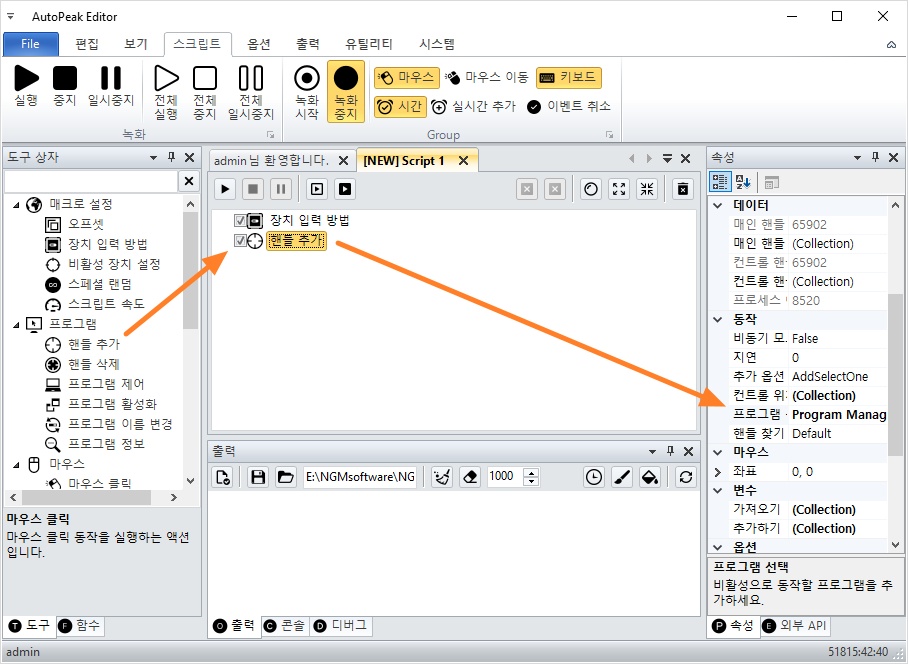 핸들 추가 액션을 스크립트에 추가한 후 윈도우 바탕화면을 선택하세요.