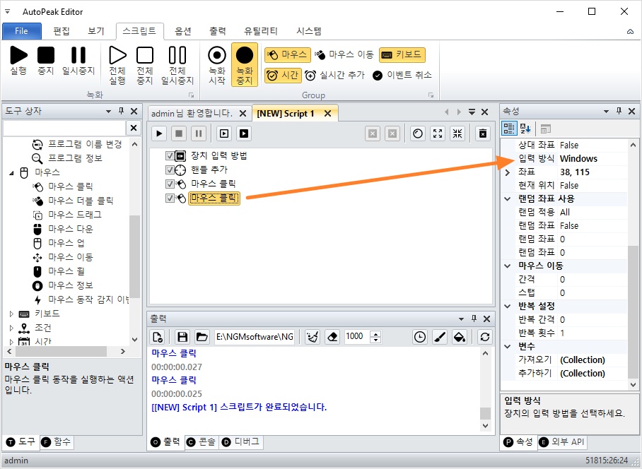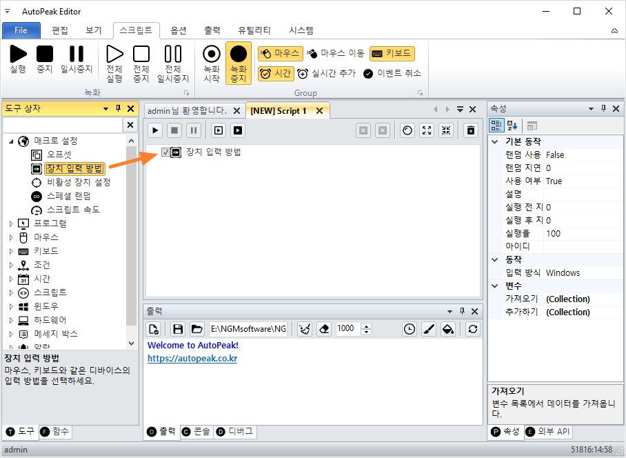 장치 입력 방법 액션을 더블 클릭해서 스크립트에 추가해주세요.