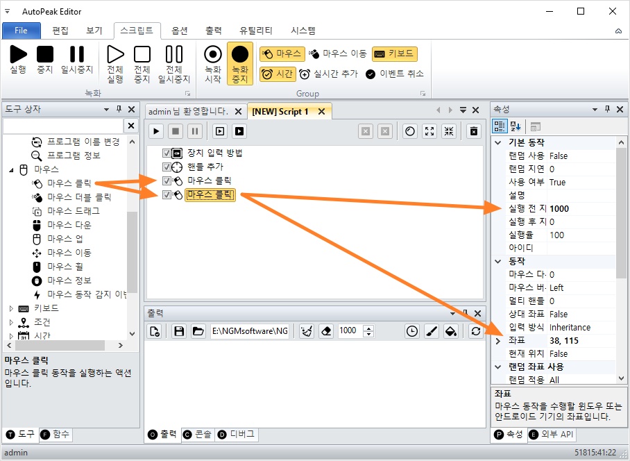 마우스 클릭을 2개 추가하고, 각각 윈도우 바탕화면의 아이콘 좌표를 설정 해줍니다.