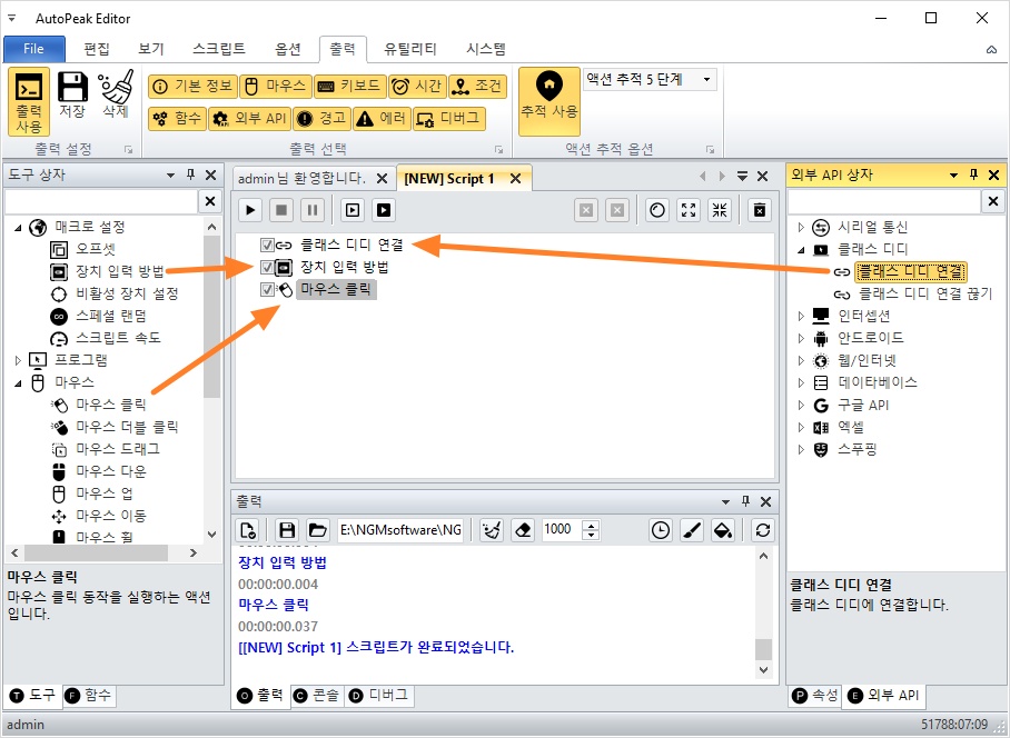 마우스 카테고리에서 마우스 클릭 액션도 추가해줍니다.