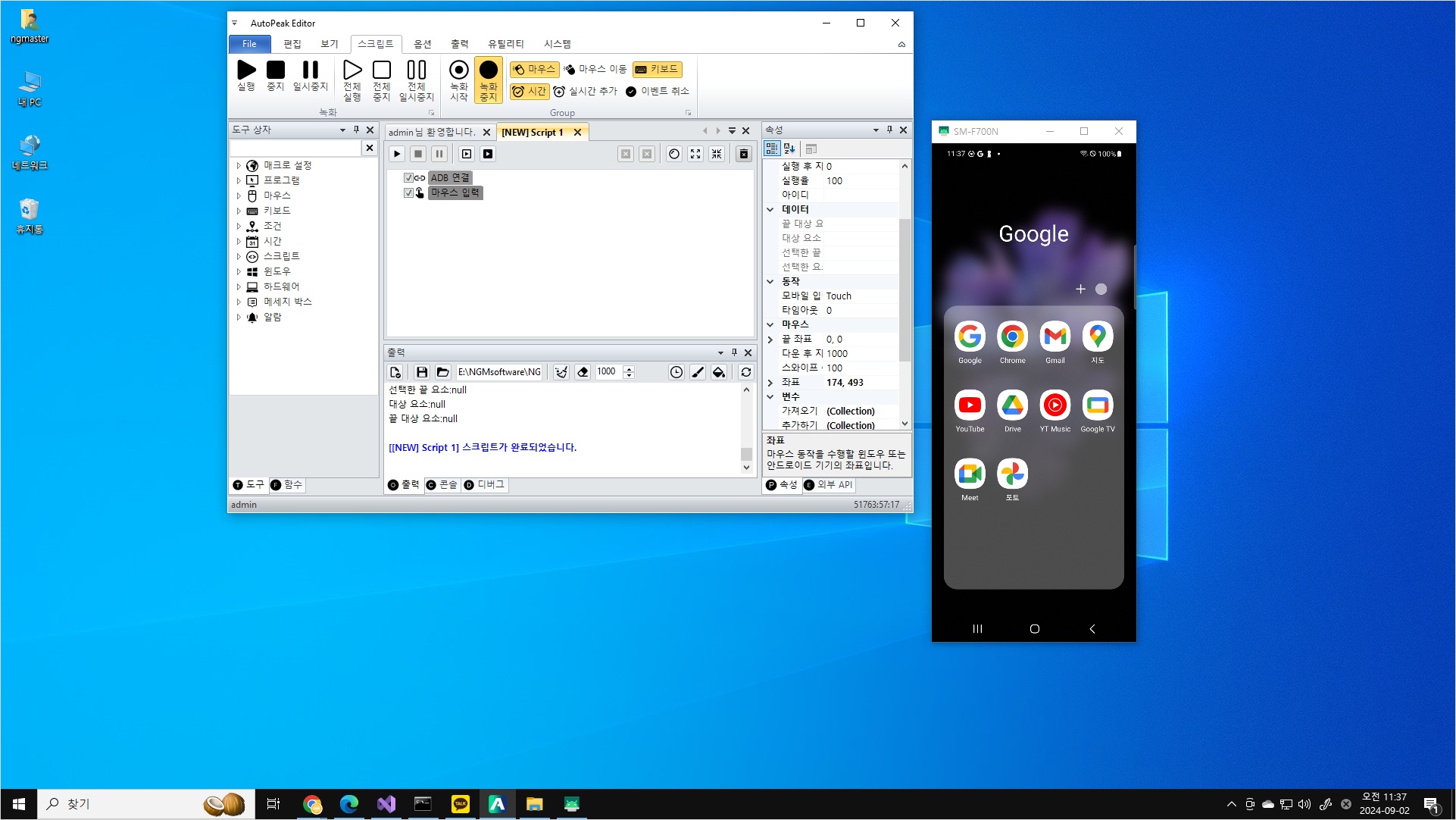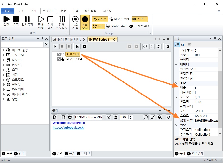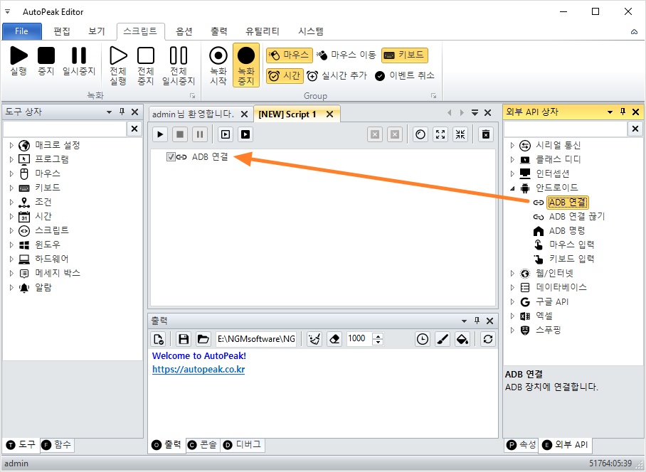 자동으로 스크립트가 생성되고 ADB 연결 액션이 추가됩니다.