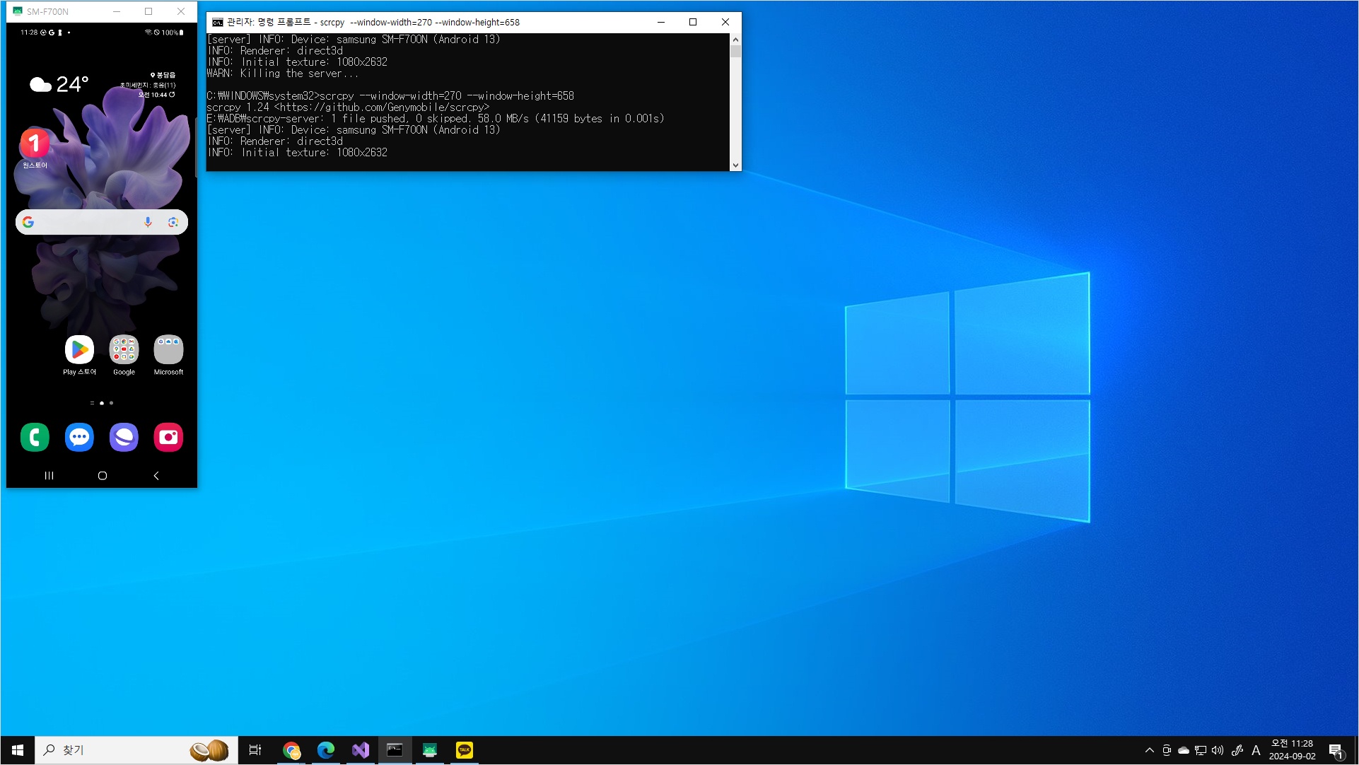 우선, 안드로이드 핸드폰을 컴퓨터에 연결한 후 SCRCPY로 윈도우에 실행 해두었습니다.