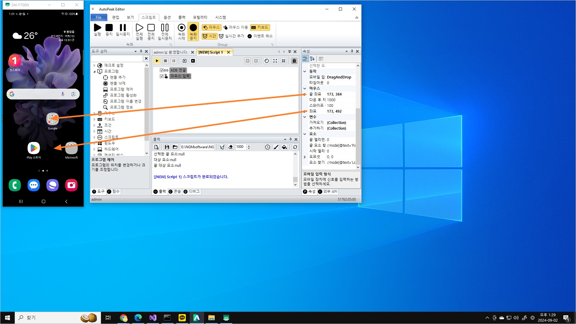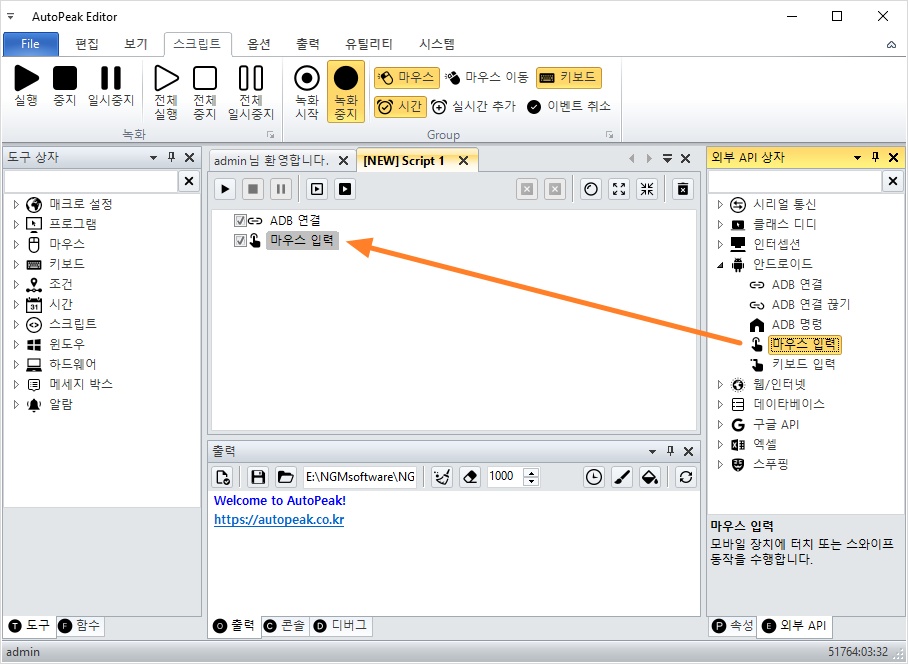 ADB 연결 액션 아래에 있는 마우스 입력 액션도 더블 클릭해서 같이 추가해주세요.