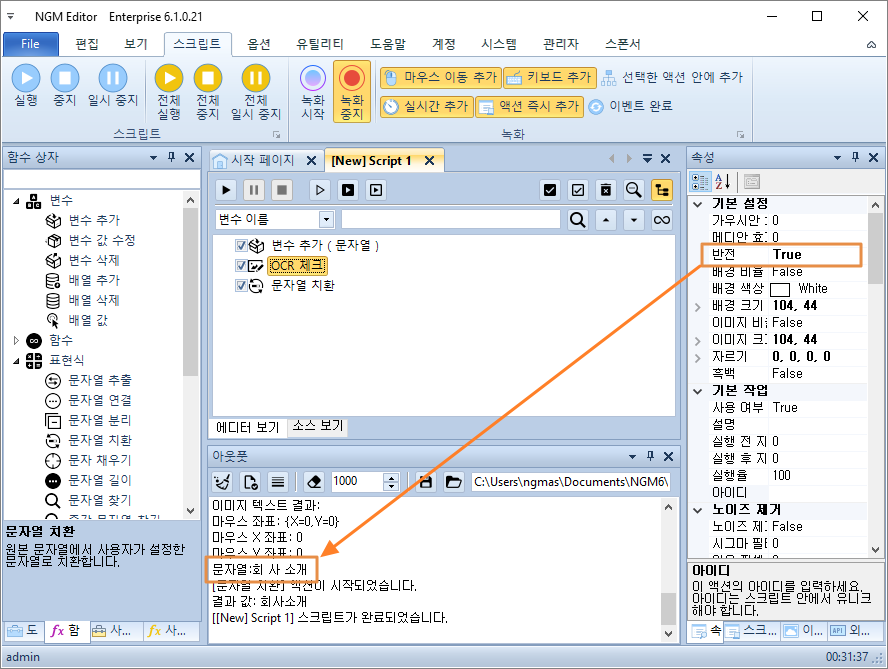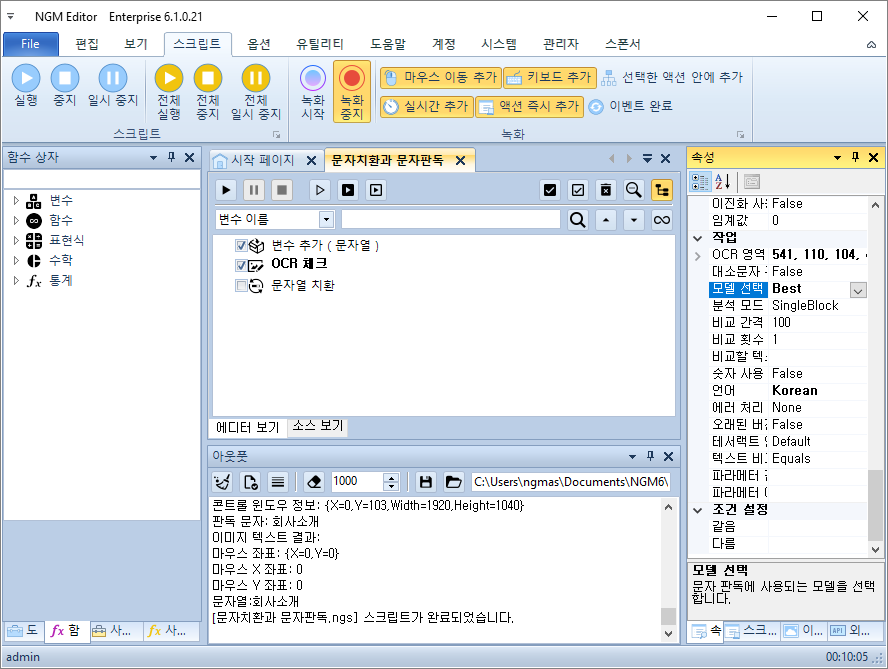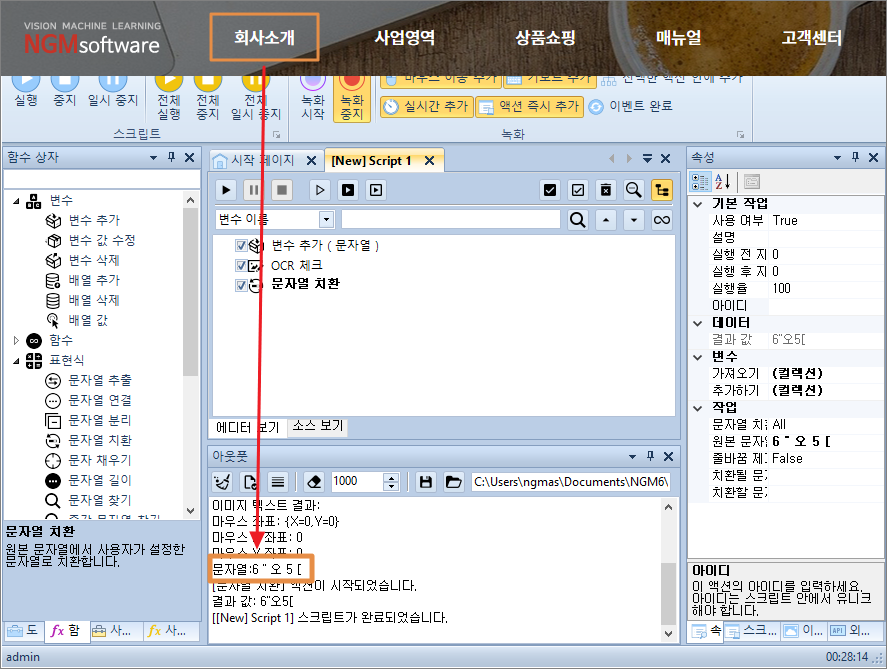 안녕하세요. 엔지엠소프트웨어입니다. 오늘은 [ 문자열 치환 ] 에 대해 알아보겠습니다. 적절한 예제가 있으면 좋겠지만~ 그렇지 못한 관계로 단순한 기능 설명이 될거 같네요. 우선, [ OCR 체크 ]를 이용해서 홈페이지의 상단 메뉴 "회사소개"를 문자로 변환해볼께요. 이 예제는 첨부 파일을 다운로드 받아서 테스트 하면 됩니다. [ OCR 체크 ]의 인식 범위만 바꾸면 됩니다. 아래와 같이 에디터를 실행하고, 스크립트을 열어보세요.