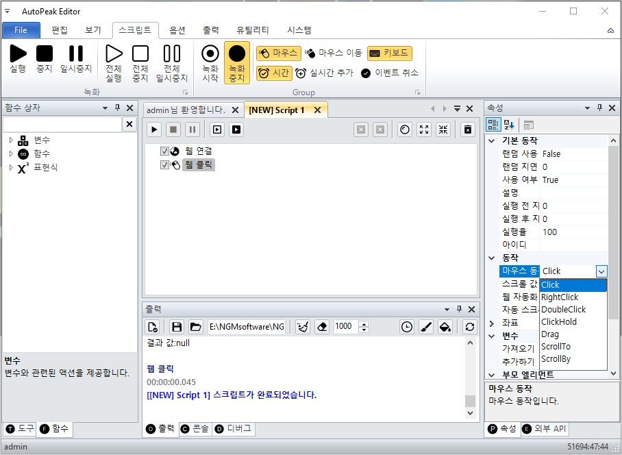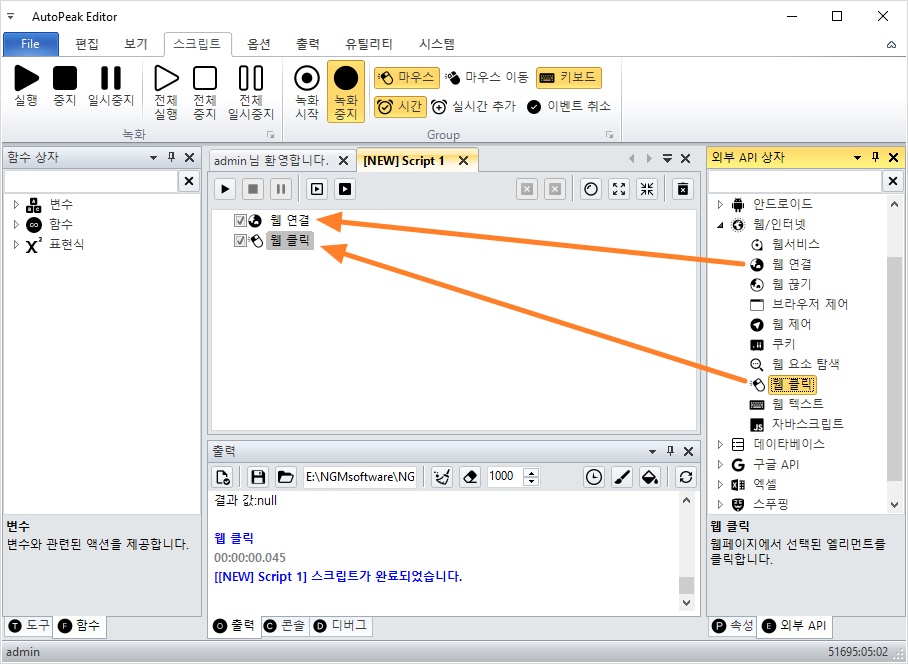웹/인터넷 카테고리를 확장한 후 웹 연결과 웹 클릭 액션을 더블 클릭해서 스크립트에 추가해줍니다.