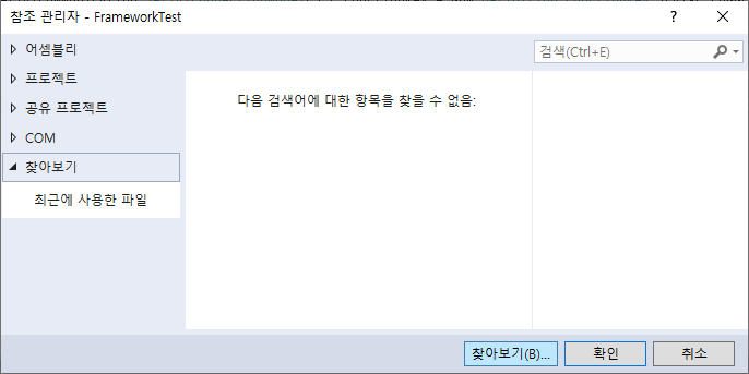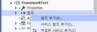우측의 솔루션(Cltr+Alt+L) 창으로 이동한 후 FrameworkTest 프로젝트의 참조에서 우클릭하세요. 아래 그림과 같이 참조 추가하세요.