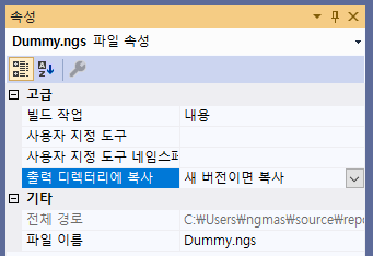 추가한 "Dummy.ngs"를 선택하고, "Alt+Enter"(속성)를 누르세요. 아래 그림과 같이 파일 속성을 변경해줍니다.