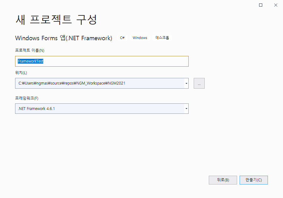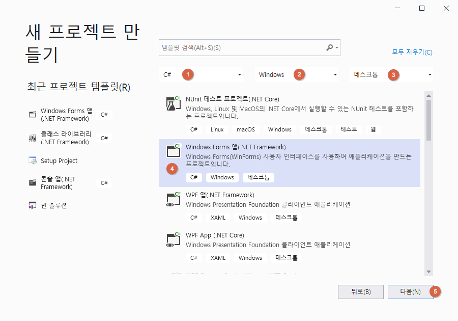 Windows Forms 앱(.NET Framework) 프로젝트를 만들기 아래 그림을 참고해서 따라해보세요.