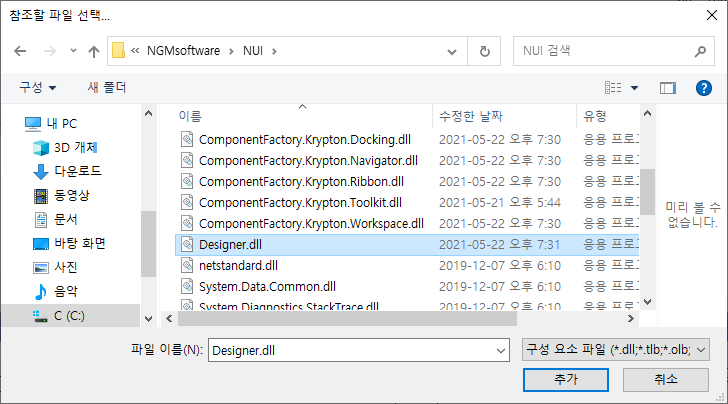 "Designer.dll"을 선택 후 "추가"를 클릭하세요.