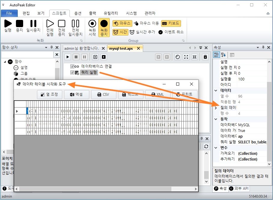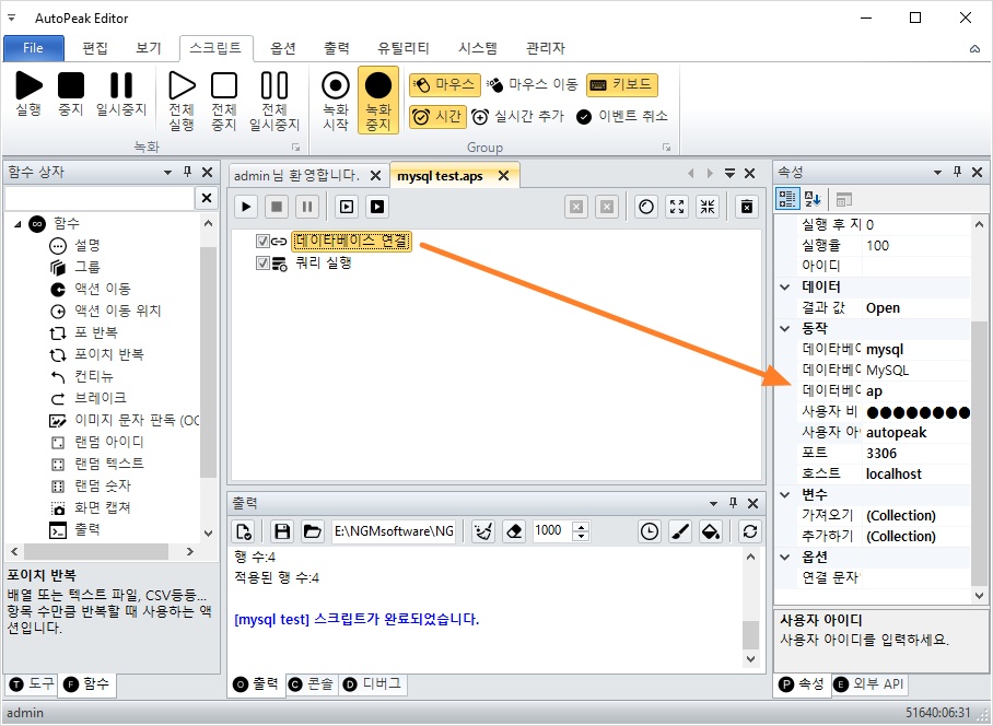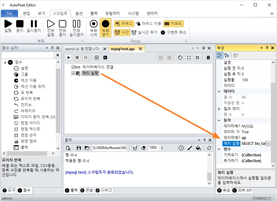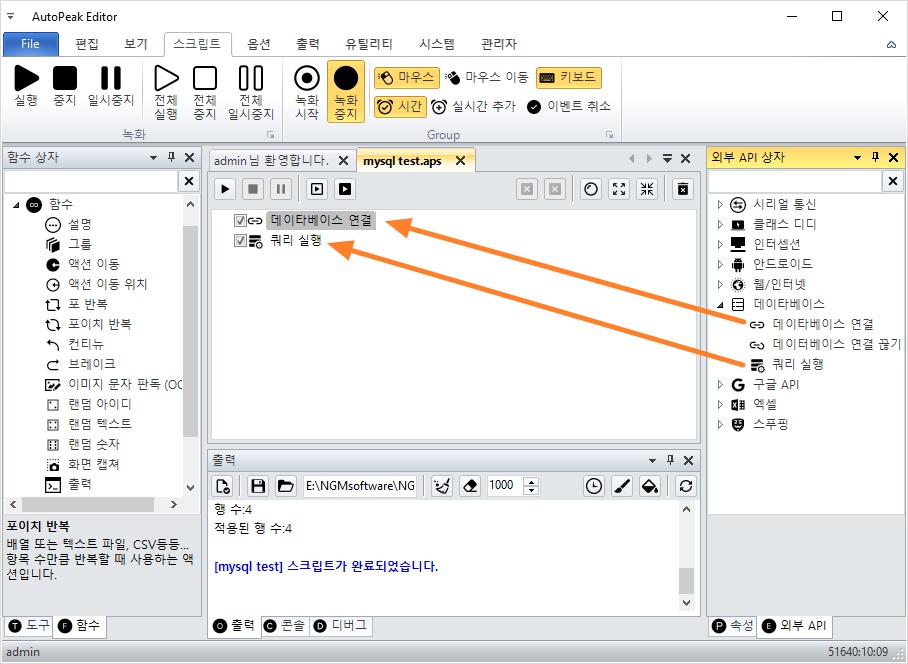 - 데이터베이스 연결 액션과 쿼리 실행 액션을 스크립트에 추가합니다.