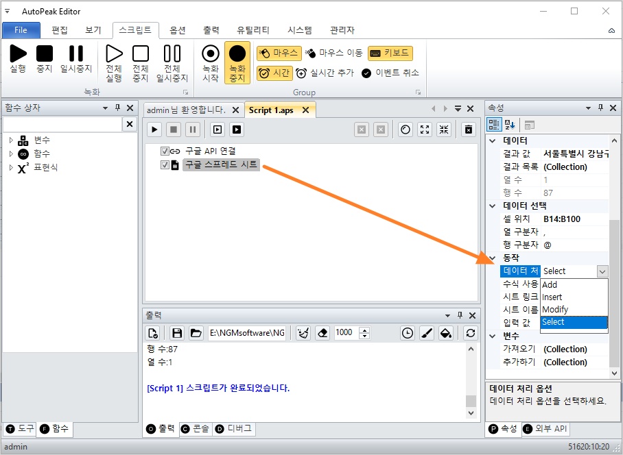 데이터 처리 옵션에 따라서 구글 스프레드시트의 데이터를 가져오거나 추가할 수 있습니다.