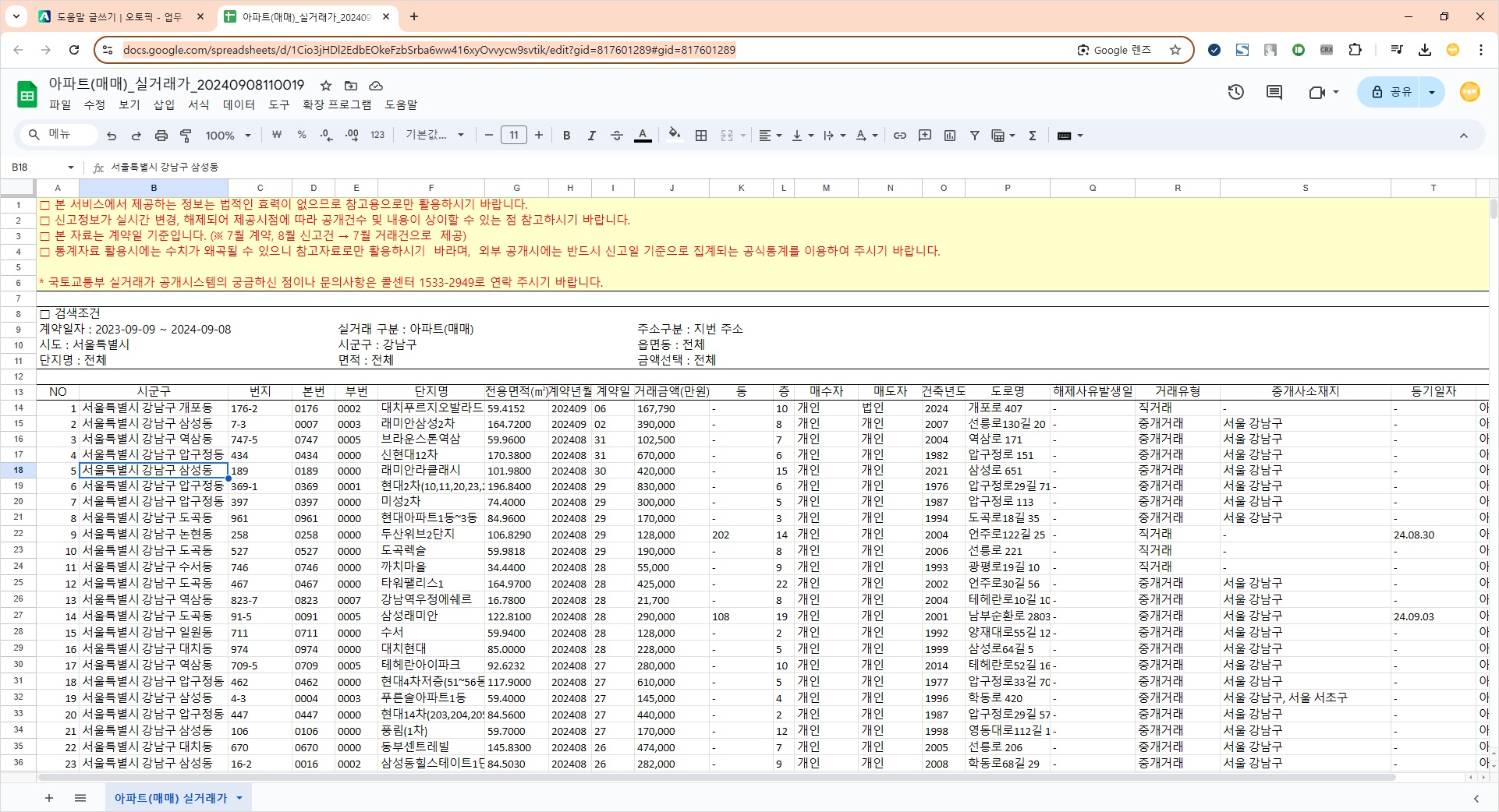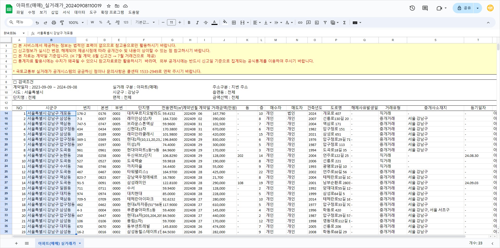 구글 스프레드시트에는 아파트 매매 실거래가를 크롤링하는 데이터가 들어있습니다.