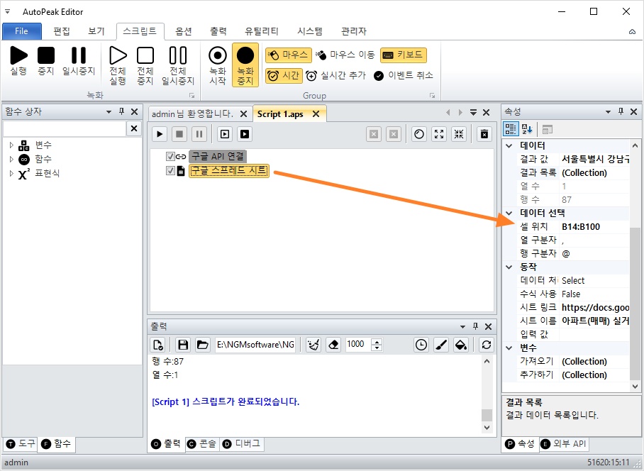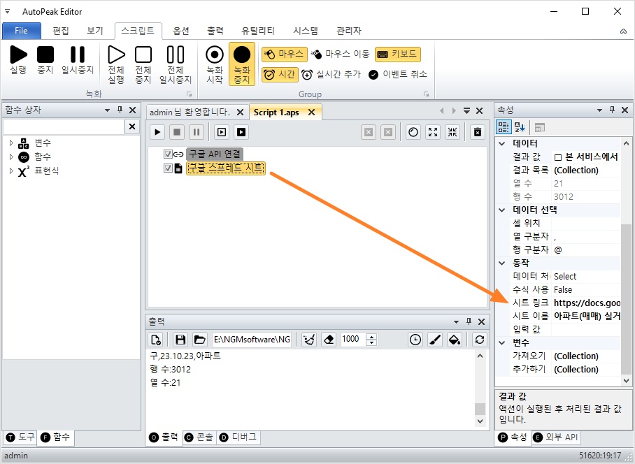 구글 스프레드 시트의 속성에 위에서 복사한 링크와 시트 이름을 입력하세요.