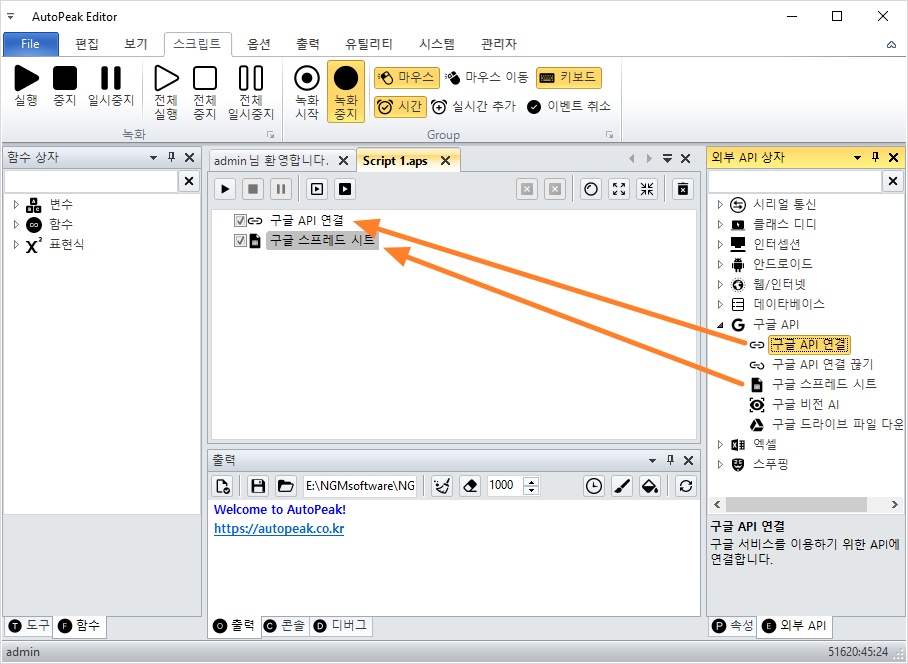 오토픽 에디터를 실행하고, 우측 하단의 외부 API를 클릭하세요.