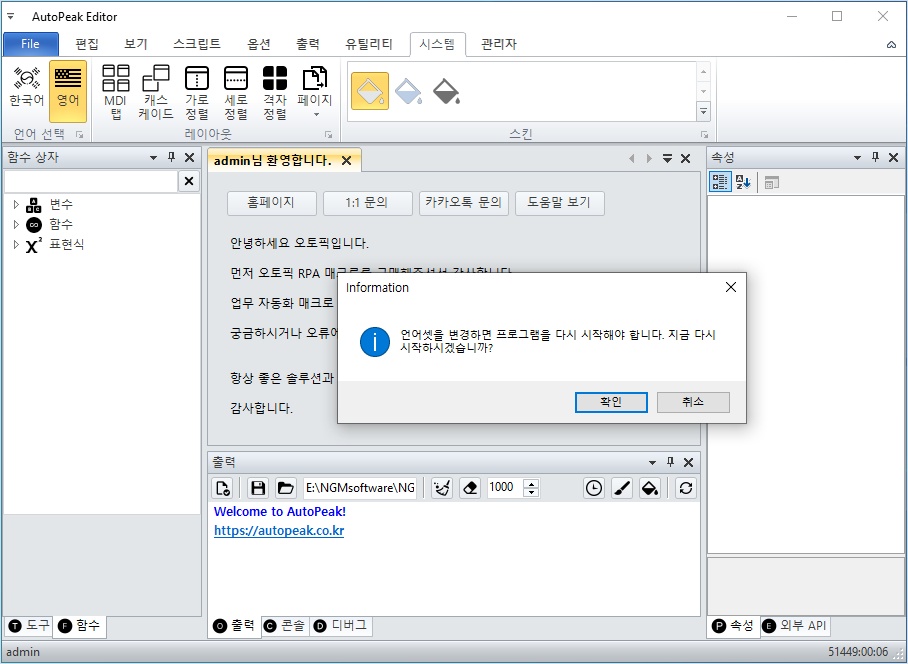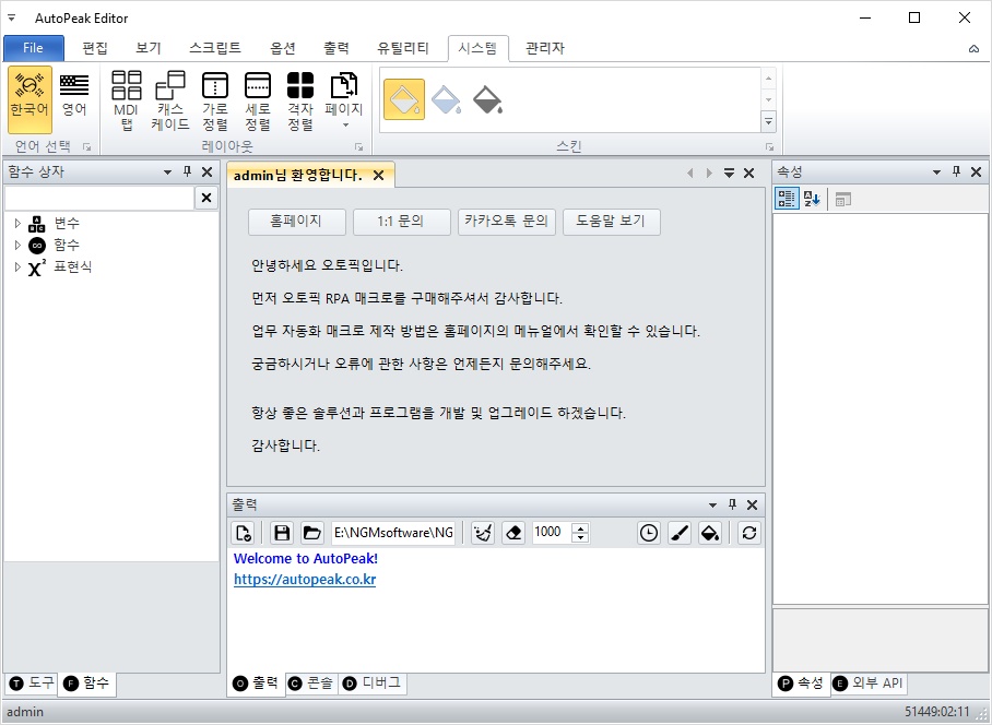 시스템에 있는 기능들은 오토픽 에디터 프로그램 시스템 속성을 변경할 때 사용합니다.
