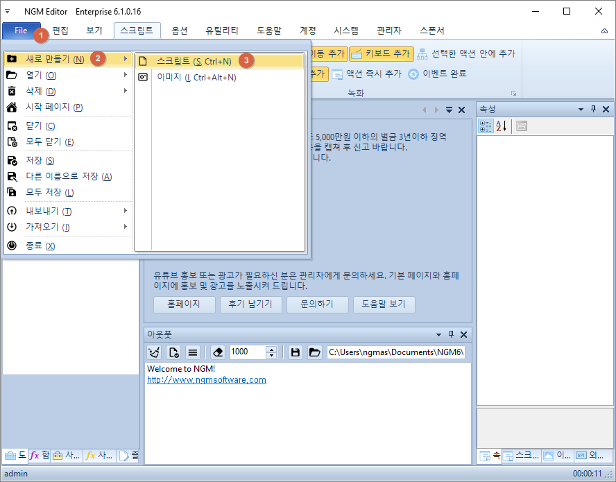 엔지엠 에디터를 실행하고 새로운 스크립트를 하나 추가하세요.