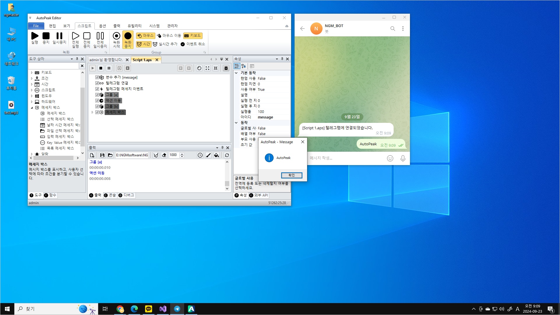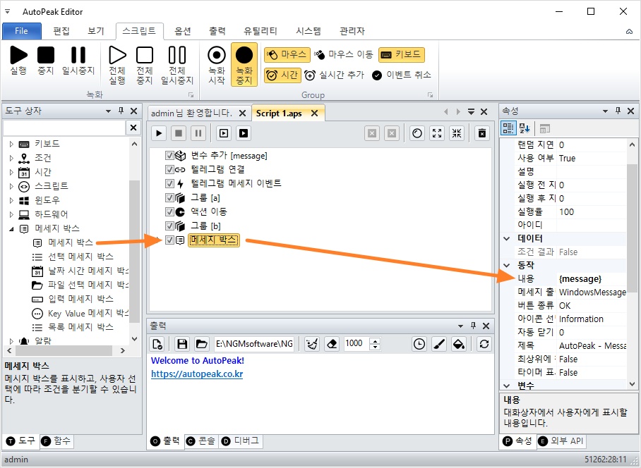 - 도구 상자 → 메시지 박스 액션 추가
