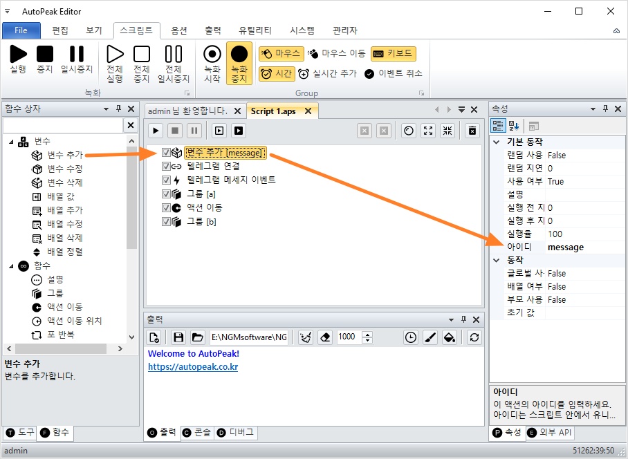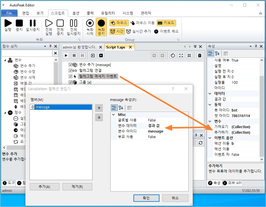 텔레그램 메시지를 확인하려면 변수를 활용합니다.