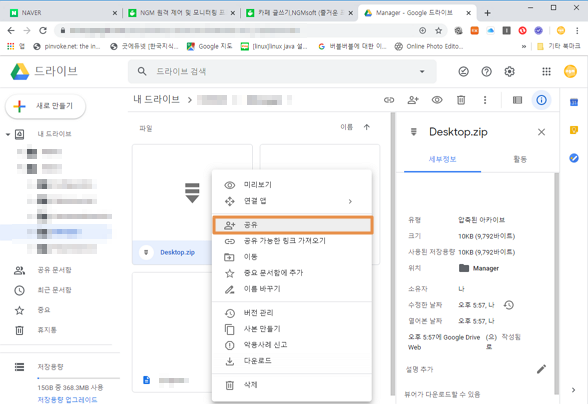 업로드가 완료되면 파일에서 우클릭 후 "공유"를 클릭하세요.