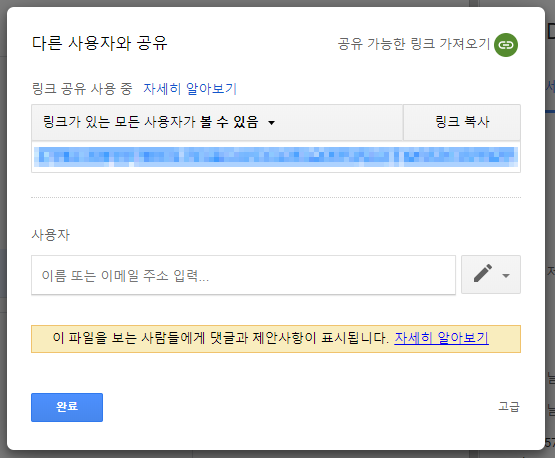 아래와 같은 팝업이 표시됩니다. 링크 복사 버튼을 누르면 클립보드에 저장됩니다.