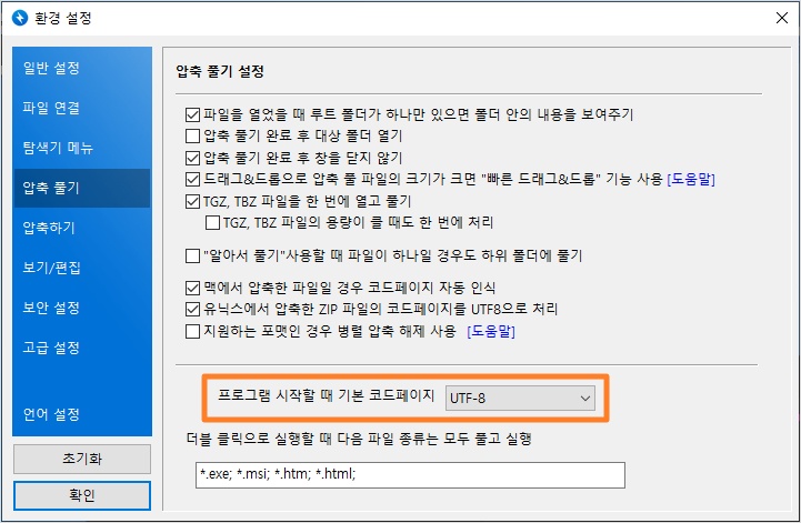 - 압축풀기 기본 코드페이지 → UTF-8 선택