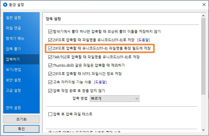 왼쪽의 압축하기 메뉴를 클릭하고 ZIP으로 압축할 때 유니코스(UTF-8) 파일명을 확장 필드에 저장에 체크하세요.
