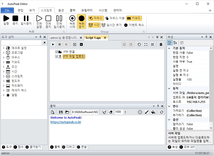 - FTP 연결 액션과 FTP 파일 업로드 액션을 각각 스크립트에 추가
