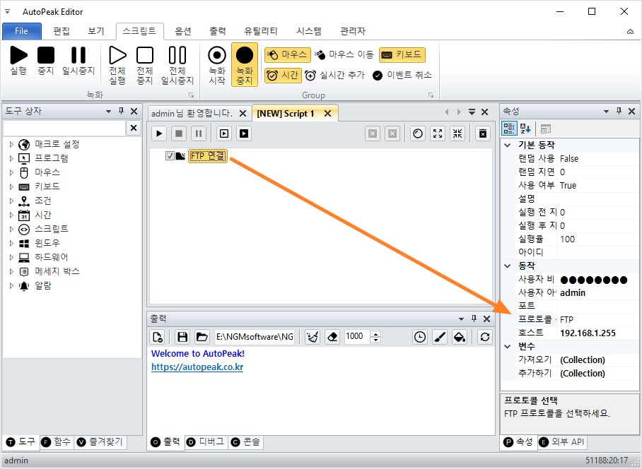 1️⃣ 오토픽 에디터 실행 및 FTP 액션 추가