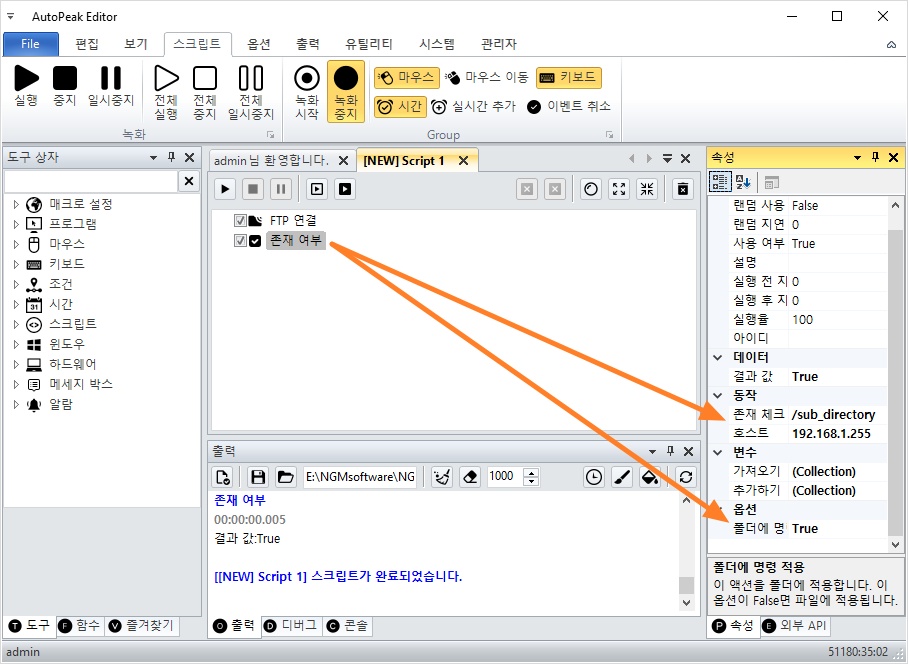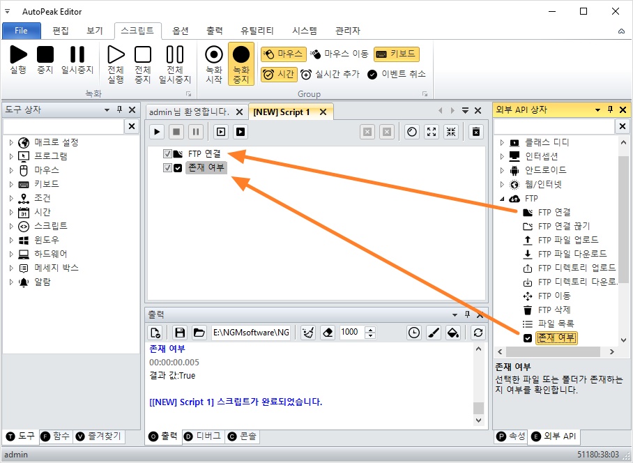 - FTP 연결 액션과 FTP 파일 존재 액션 더블 클릭 → 스크립트에 추가