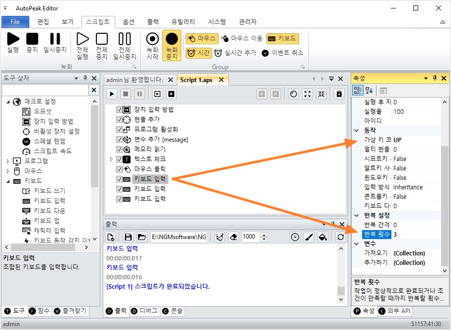 첫번재 키보드 액션에서 위로 3번 동작하도록 설정하세요.