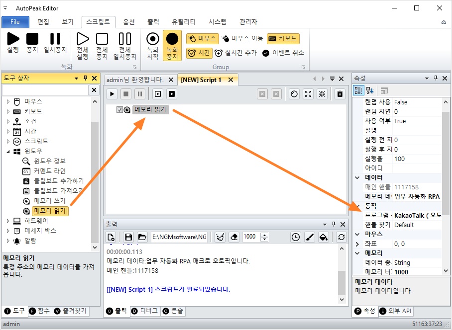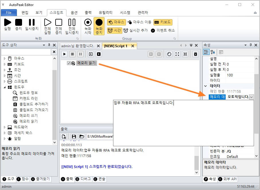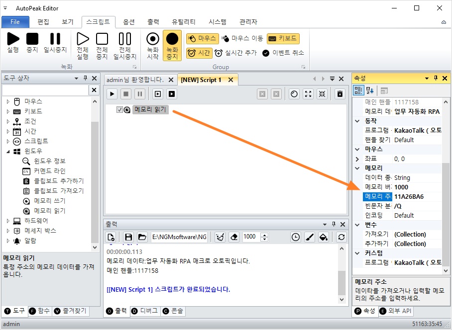 - 오토픽 에디터에서 메모리 읽기 액션 추가
