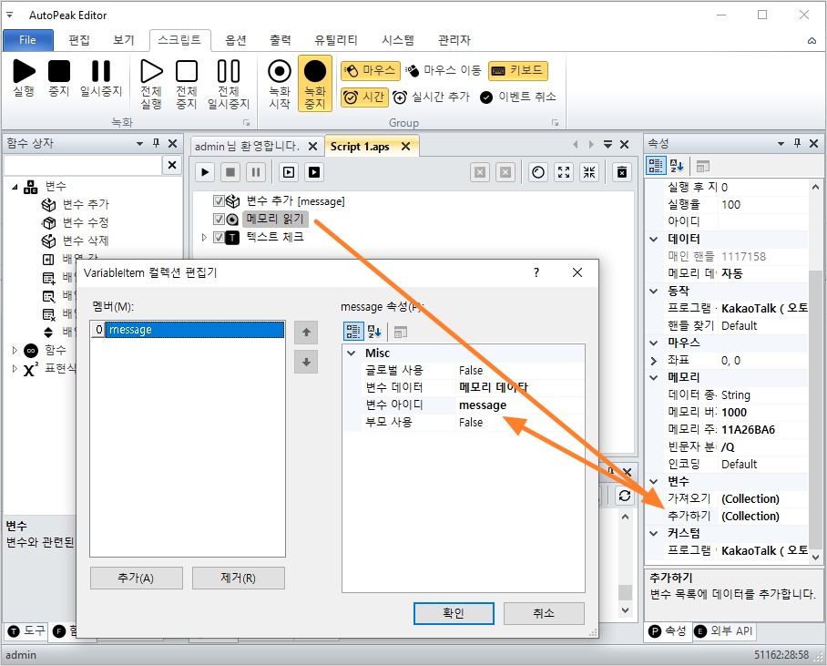 - 메모리 읽기 액션 속성 → 변수 추가 → VariableItem 컬렉션 편집기