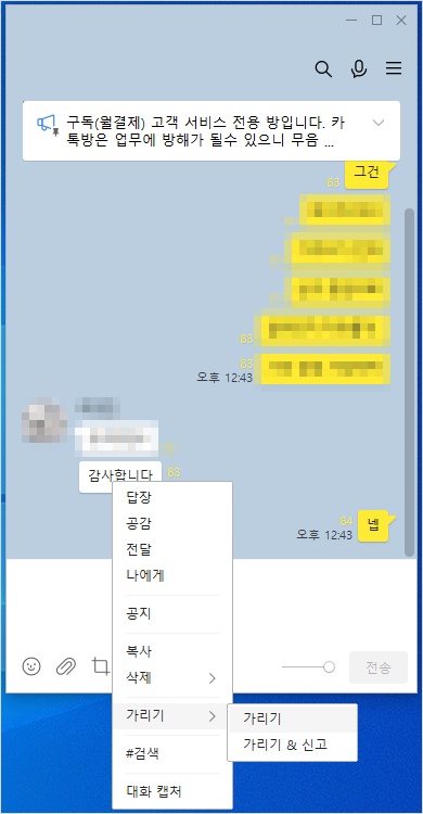 만약, 팀채팅이나 오픈채팅이라면 우클릭 후 보여지는 메뉴가 다를겁니다.