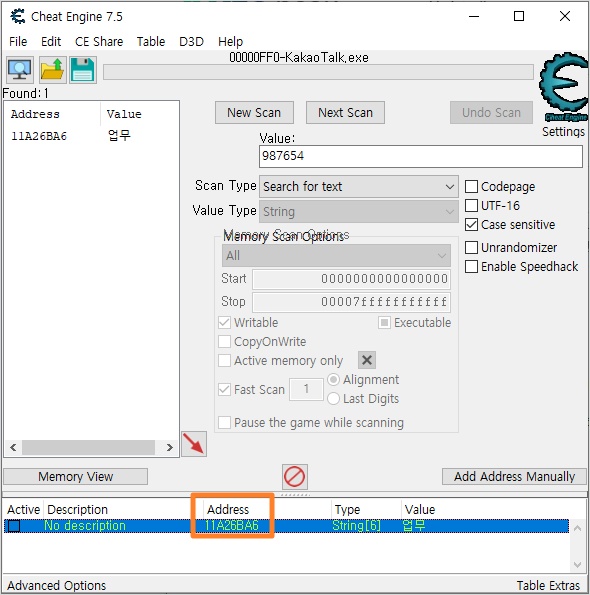 - 메모리 주소: 치트 엔진에서 확인한 카카오톡 메시지 컨트롤 주소 입력
