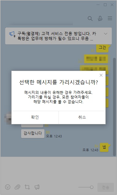 가리기의 경우에는 아래와 같이 메세지 박스가 표시됩니다.