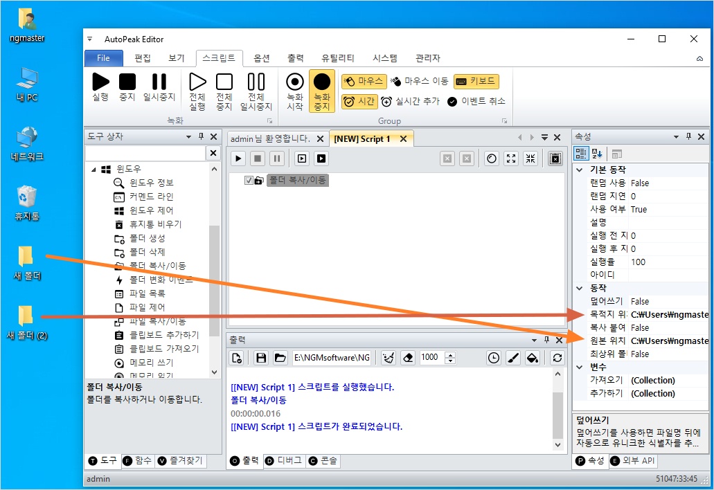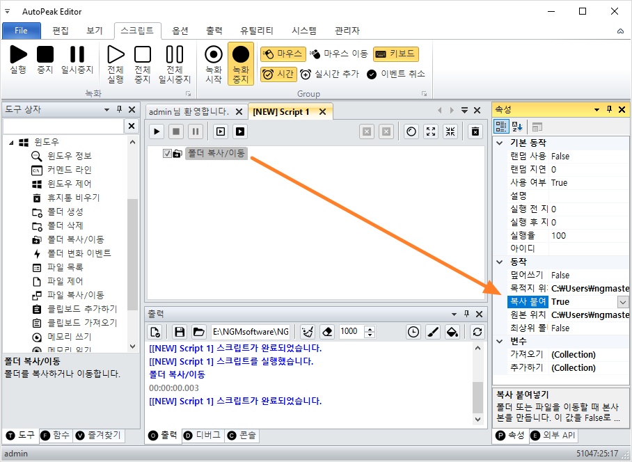 - 폴더 이동/복사 액션 더블 클릭 → 스크립트에 자동 추가