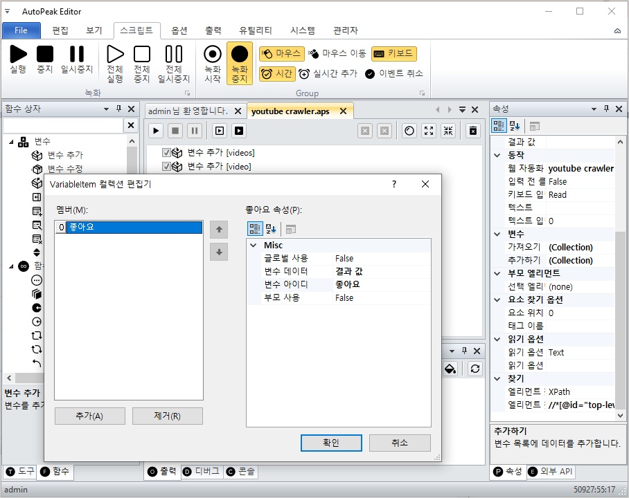 웹 자동화 이름은 둘다 youtube_crawler로 선택한 후 엘리먼트 찾기 옵션 값을 입력하세요.