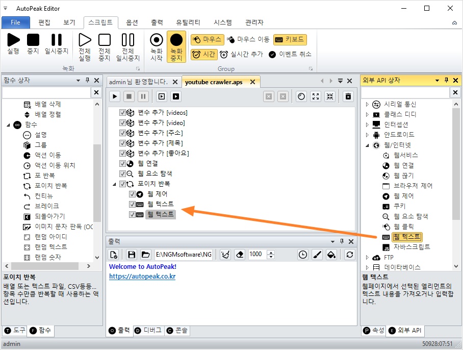 웹 텍스트 액션은 각각 아래와 같이 텍스트를 읽어옵니다.