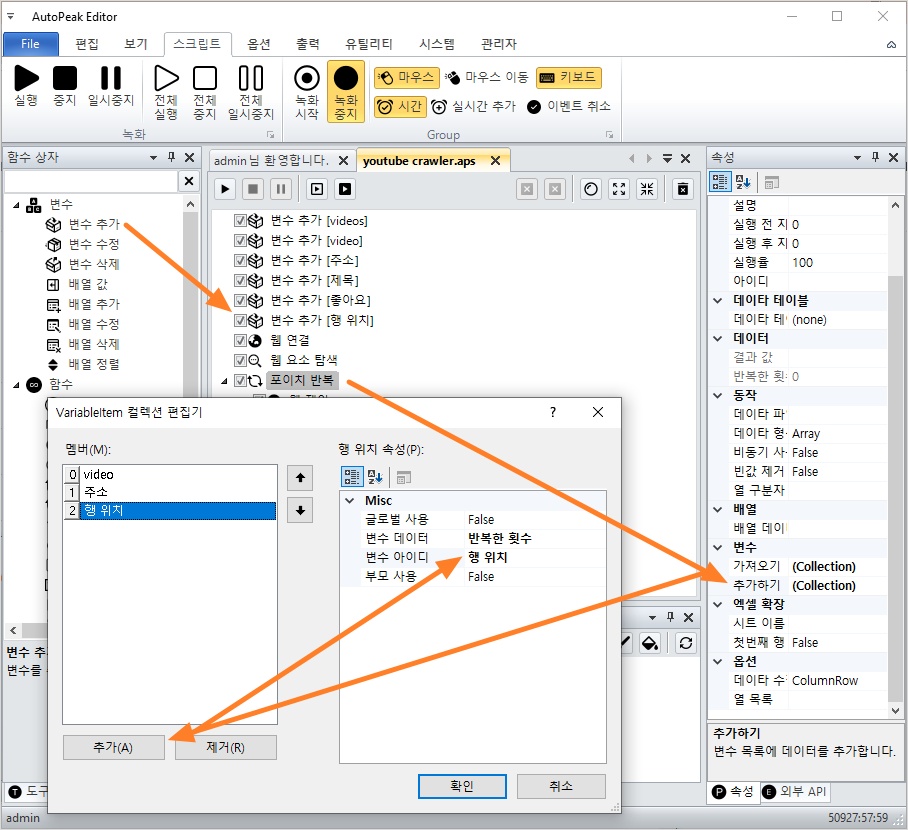 아래와 같이 포이치 반복 액션에서 변수 추가하기를 클릭하고, 주소 변수에 데이터를 저장하세요.