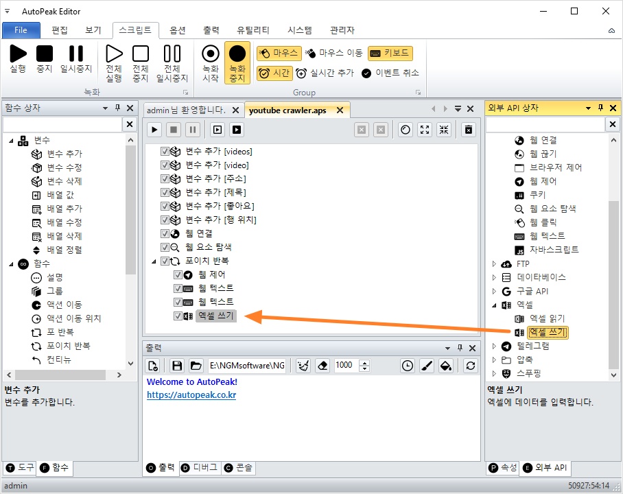 마지막으로 엑셀 쓰기 액션을 추가하세요.