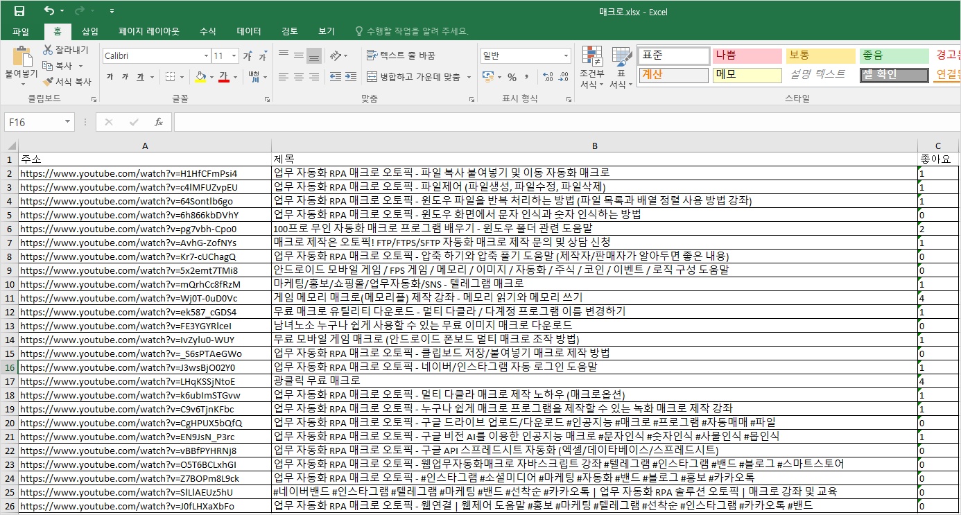 아래 그림과 같이 유튜브 동영상 주소와 제목 그리고, 좋아요 수를 하나씩 기록한걸 확인할 수 있습니다.