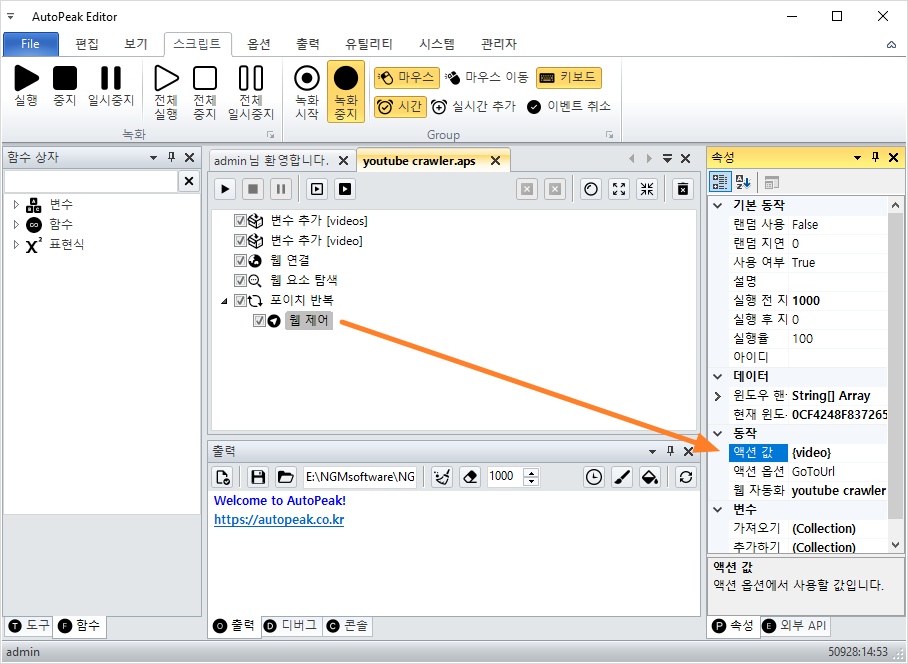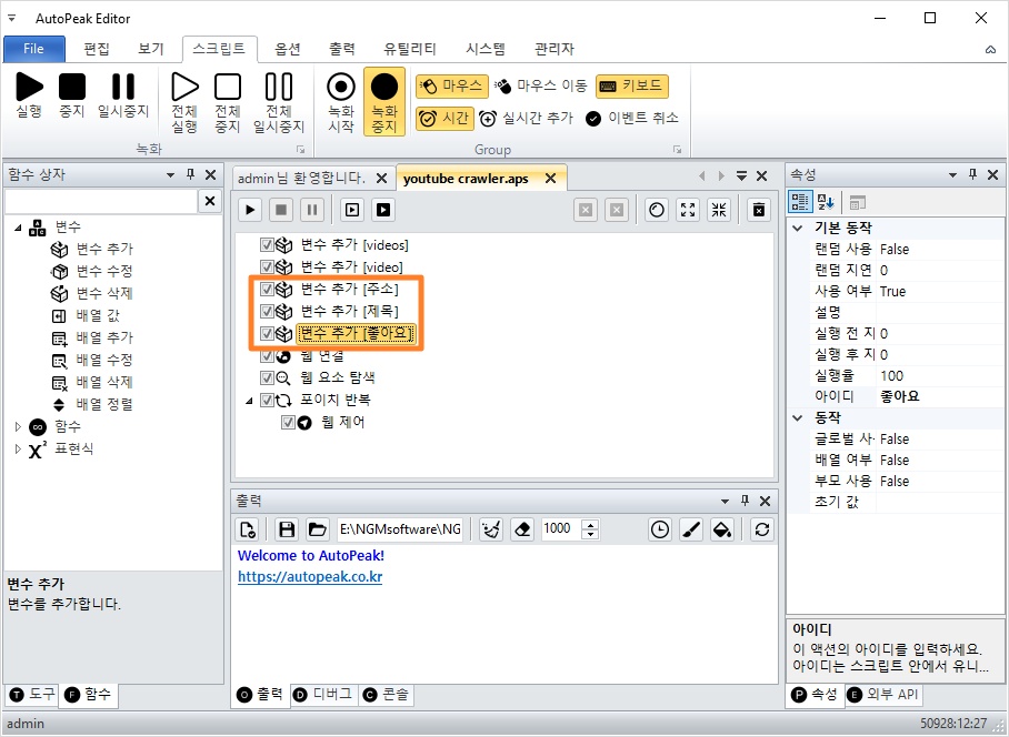 유튜브 동영상의 제목과 좋아요 수를 가져오기 위해 웹 텍스트 액션 2개를 추가했습니다.