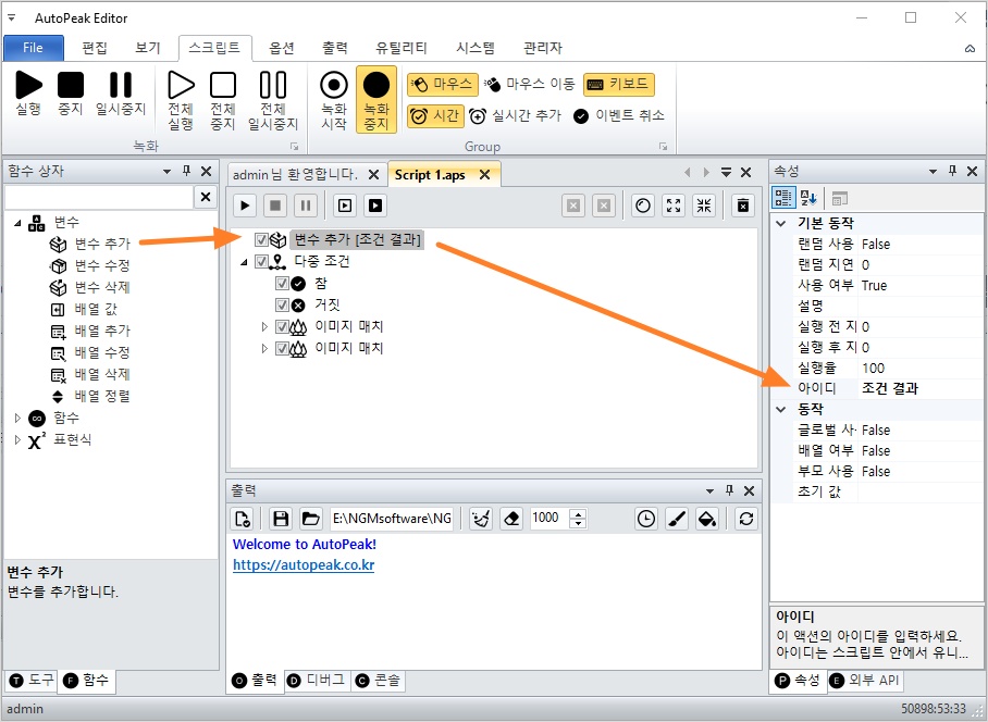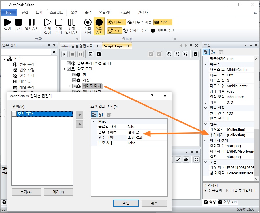 픽셀 서치와 이미지 서치 그리고, 이미지 매치는 조건이 참일 때 사용자가 좀 더 쉽게 내용을 파악할 수 있게 메세지를 변수에 저장할 수 있습니다.