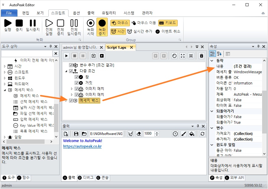 변수에 저장된 결과 값을 확인하기 위해 메세지 박스 액션을 하나 추가하고, 내용에 변수를 가져오도록 설정하세요.