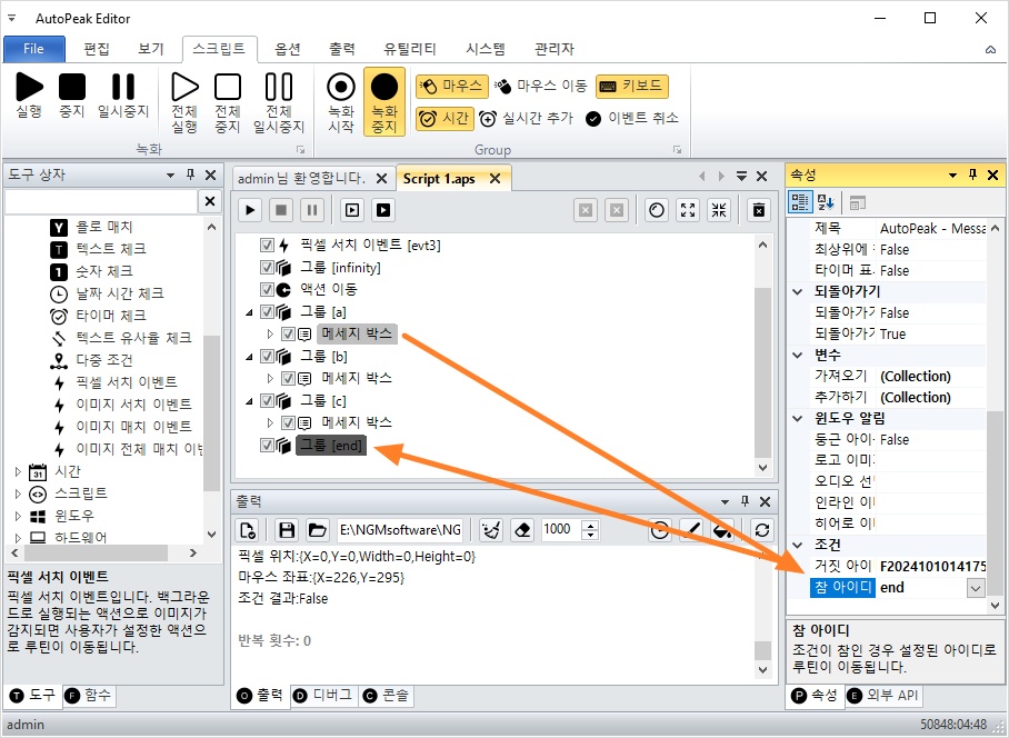 그룹 인피니티(infinity)와 액션 이동으로 스크립트가 완료되지 않도록 무한 반복 루틴을 만들어줍니다.