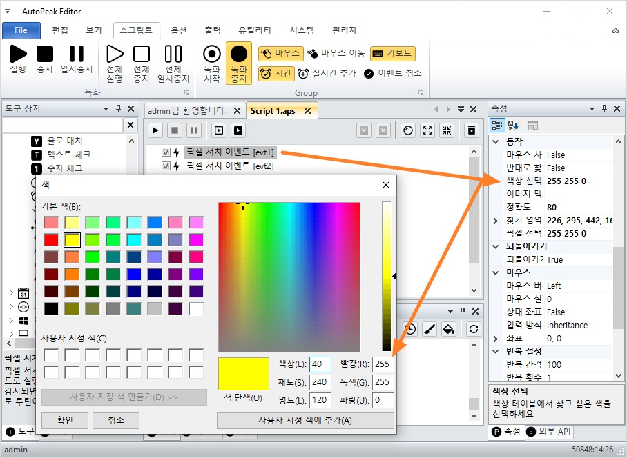 이 내용을 테스트하기 위해 오토픽 에디터를 실행하고 픽셀 서치 이벤트 액션을 추가하세요.
