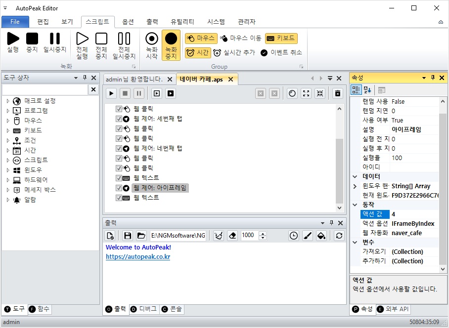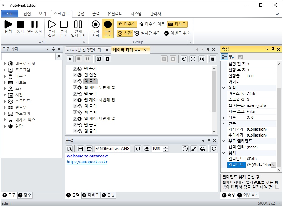 오토픽 에디터를 실행하고, 홈페이지의 제품소개 > 스크립트에서 네이버 카페 스크립트를 다운로드 받은 후 에디터에서 열어보세요.