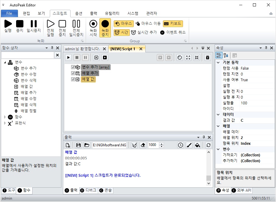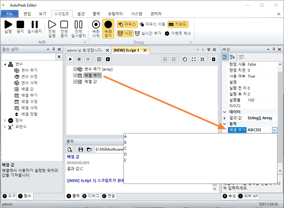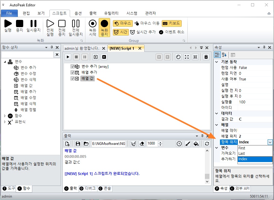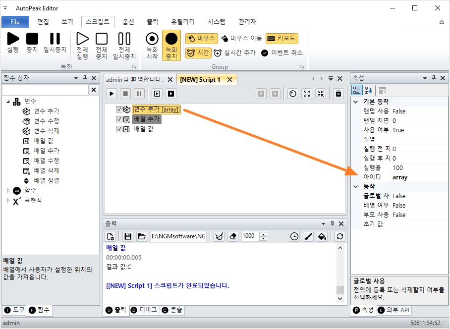 - 오토픽 에디터 실행 → 변수와 배열 추가 → 배열 값 액션 추가